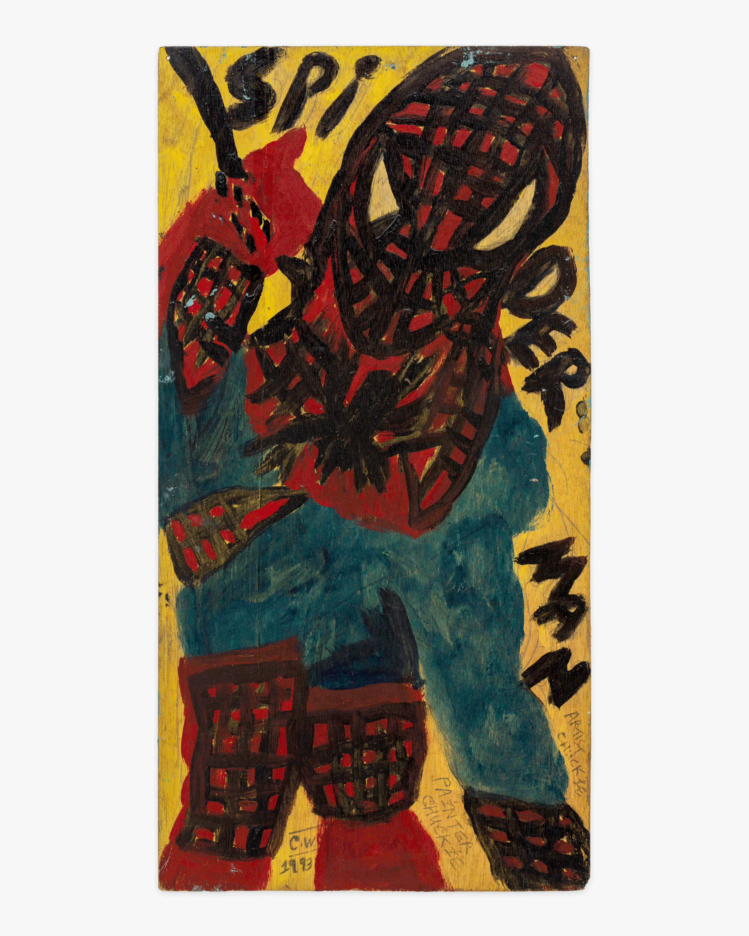 Spiderman (recto) and tiger (verso), ca 1990s, acrylic, graphite and pen and ink on wood, 27 x 14 in.