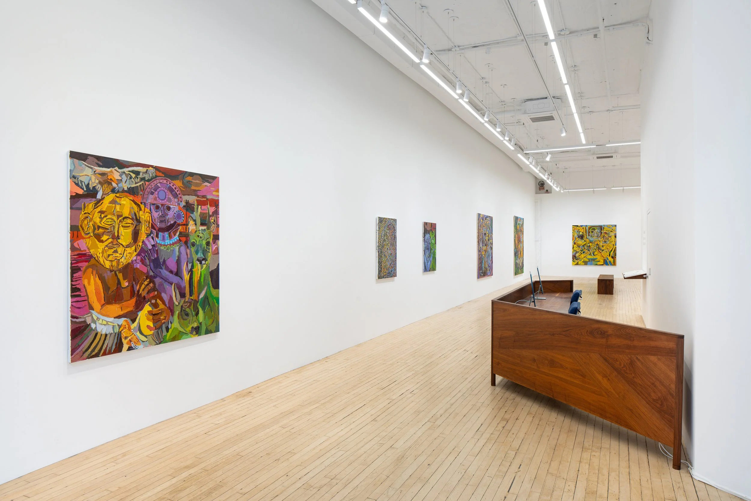 Displaying an almost visionary prowess for divining his imagery, Steed’s works feel incredibly prescient as they relay imagined paths backwards and forward in time. His instinctual ability to dissect picture planes and reconfigure scenes has never felt more urgent, as he processes complex visions of time travel, floating orbs, AI embodiment, cannibalistic astronauts, shamanistic rituals, UFOs, and even the CERN super collider.