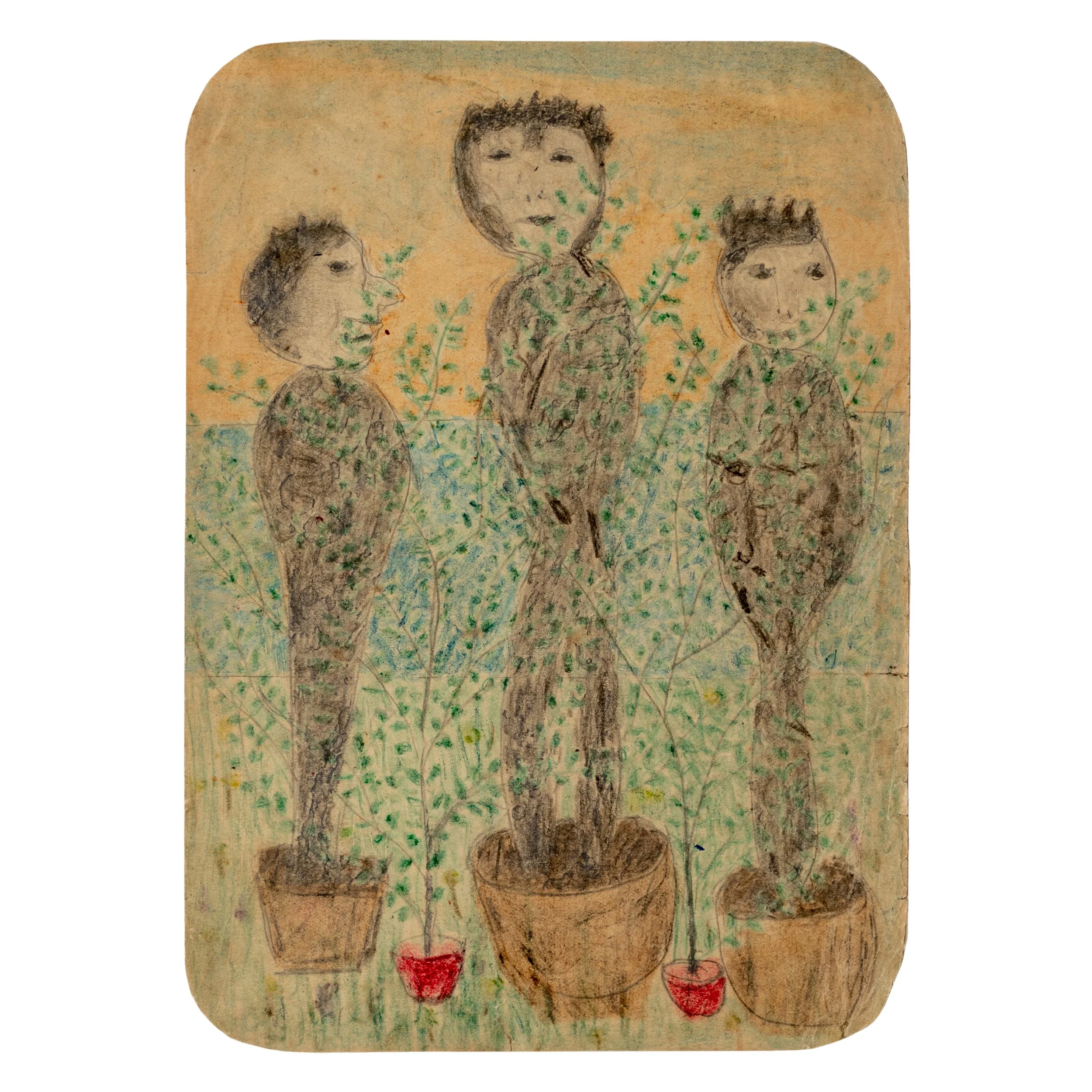 Minnie Evans: Untitled (three floral figures) 6.75 x 5 in