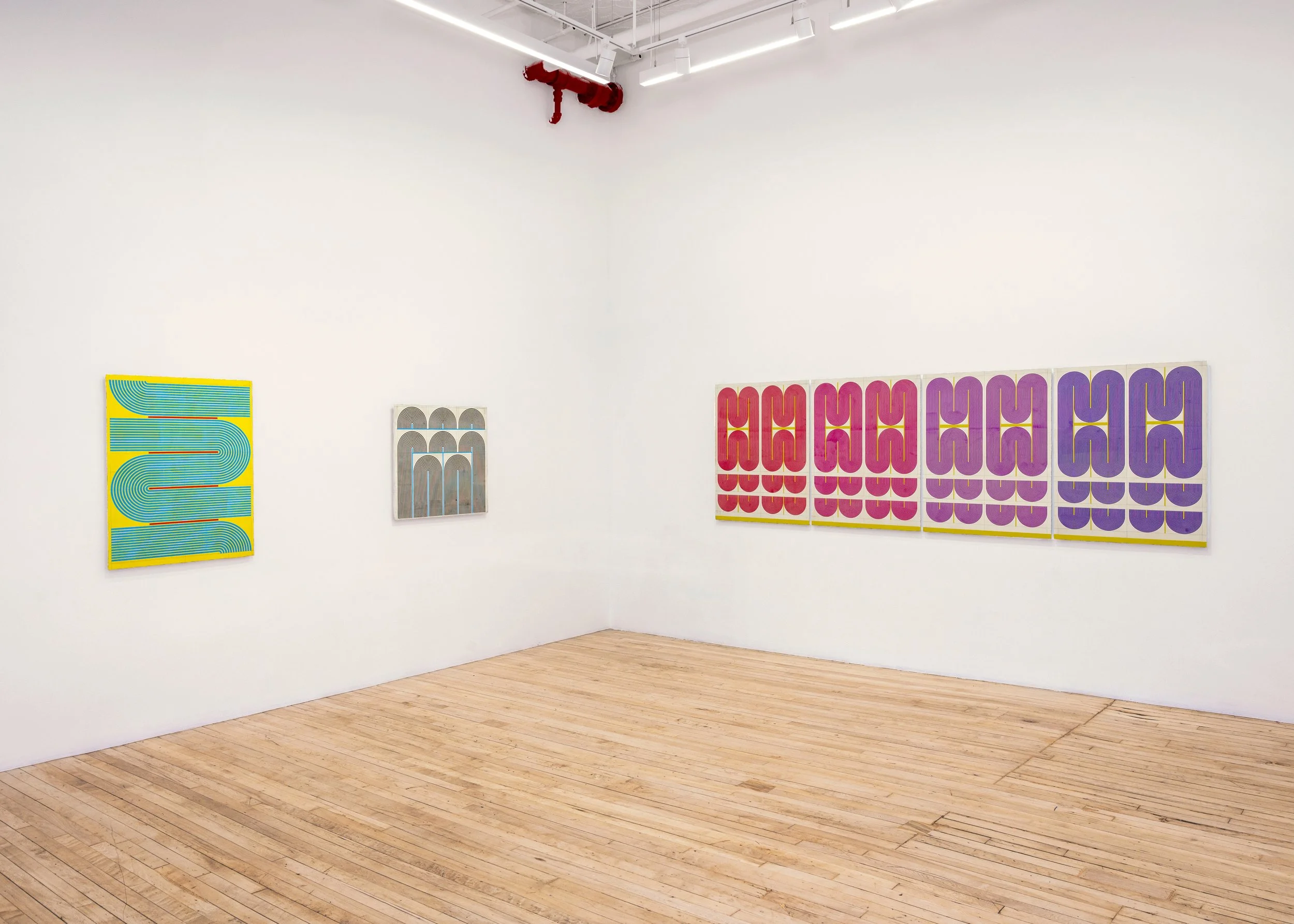 With contrasting palettes and variations in her motifs, Ferguson’s paintings inspire surprisingly complex emotions and states of mind. Works executed in magenta and black feel punk-ish and cool; works in teal and yellow feel sedate and self-reflective. The play of positive and negative spaces resulting from the repetitive silk screening process leads to vibrational patterns and feelings of movement when there is no actual movement. Relinquishing to these waves of buzzing energy is meditative and energizing, and it provides a reboot for any willing takers.