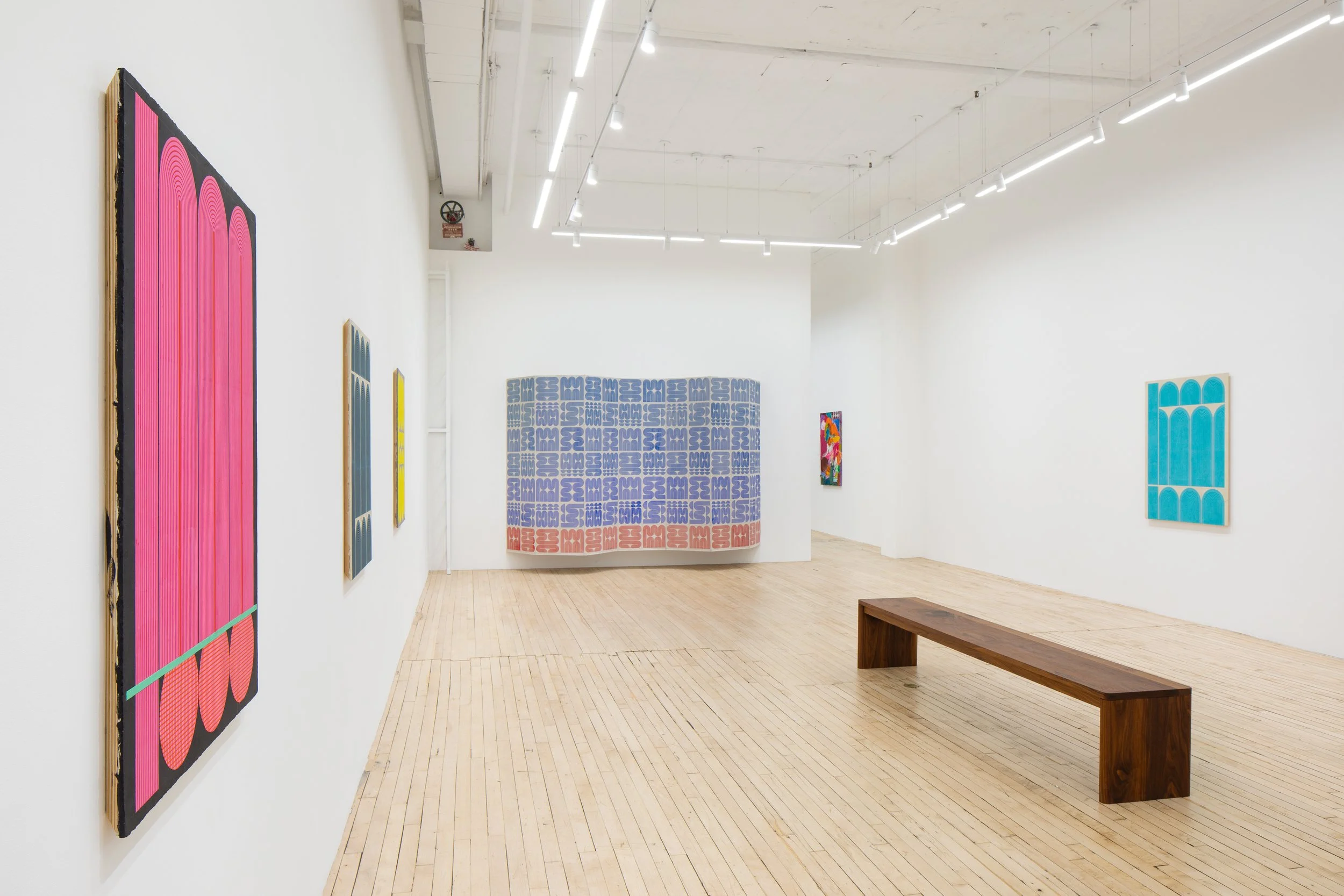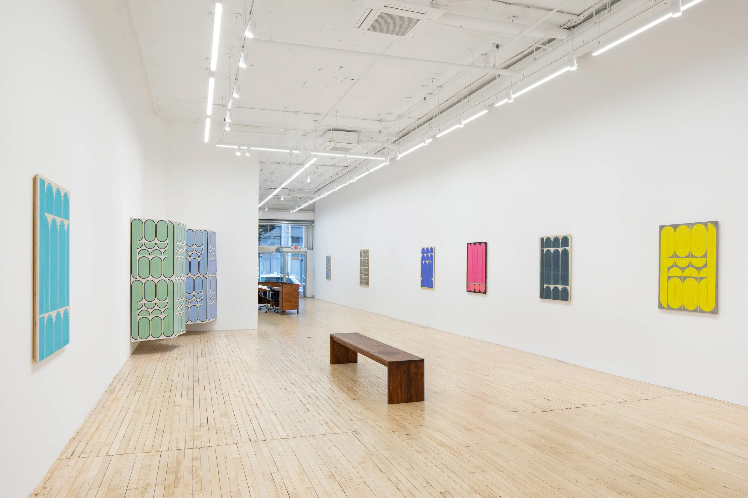 Balancing precision with irregularity is the guiding principle in Elise Ferguson’s richly layered paintings. Her labor-intensive process begins with applying multiple rounds of pigmented Venetian plaster onto panels, which are then drawn over with imperfect guidelines in graphite to help register multiple rounds of silkscreened plaster in repeating geometric designs. Embracing this system's inevitable misalignments and uneven results imbues the works with unexpected texture, energy, and a palpable sense of touch. While the paintings initially appear exacting and machine-made, they quickly reveal a hand-hewn quality that animates and enlivens the surfaces.