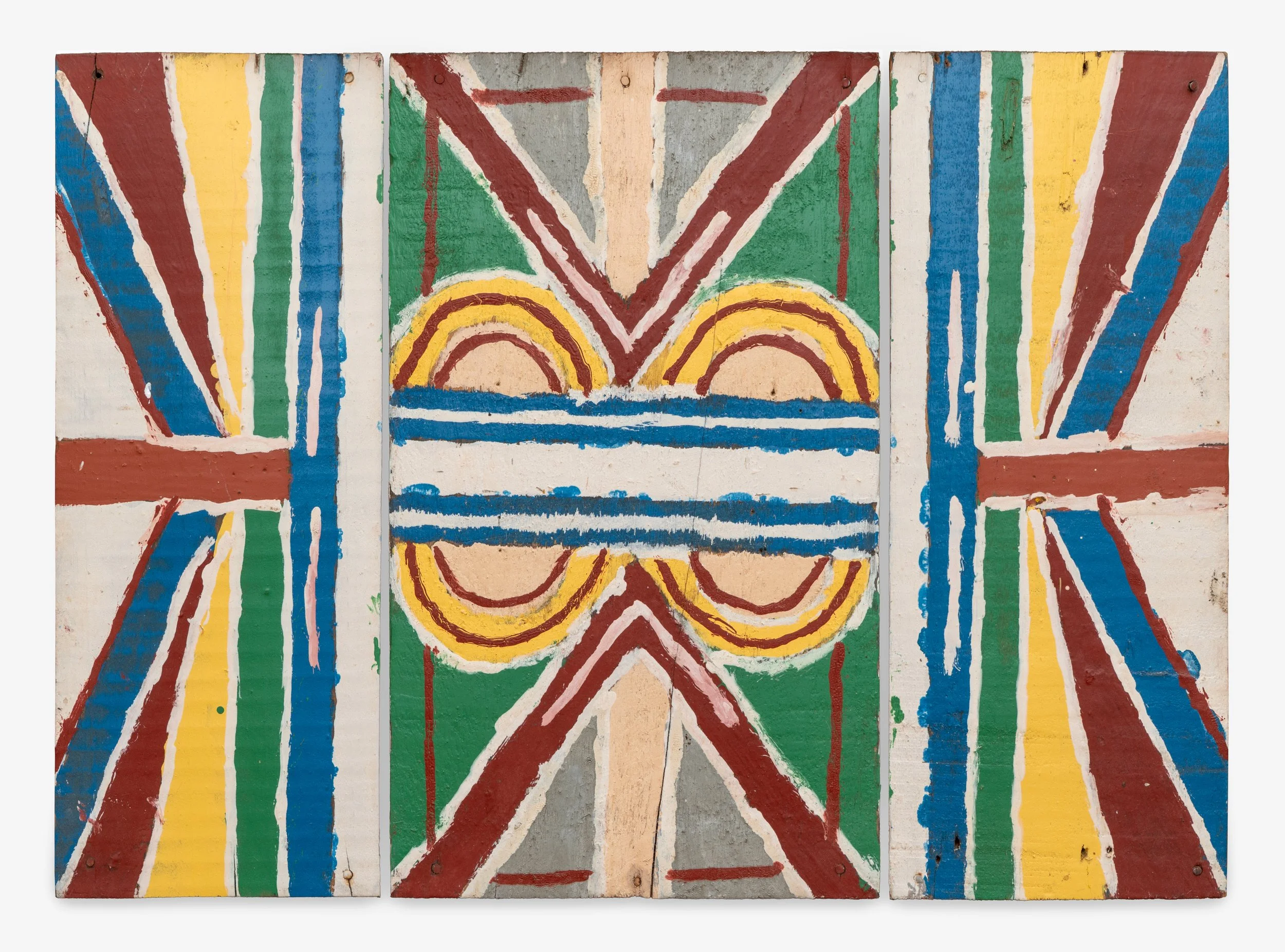 The “pretties” contained in his shed featured symmetric and repetitive forms strung into constructions several feet in length. These were anchored by a series of paintings Blagdon installed stacked or facing down to the earth; they employ concentric circles or squares and often radiate from a center point. After his death in 1986, the “machine” was purchased by Dan Dryden. Dryden spent decades caring for the work, and Kohler Foundation, Inc., purchased it in 2004.