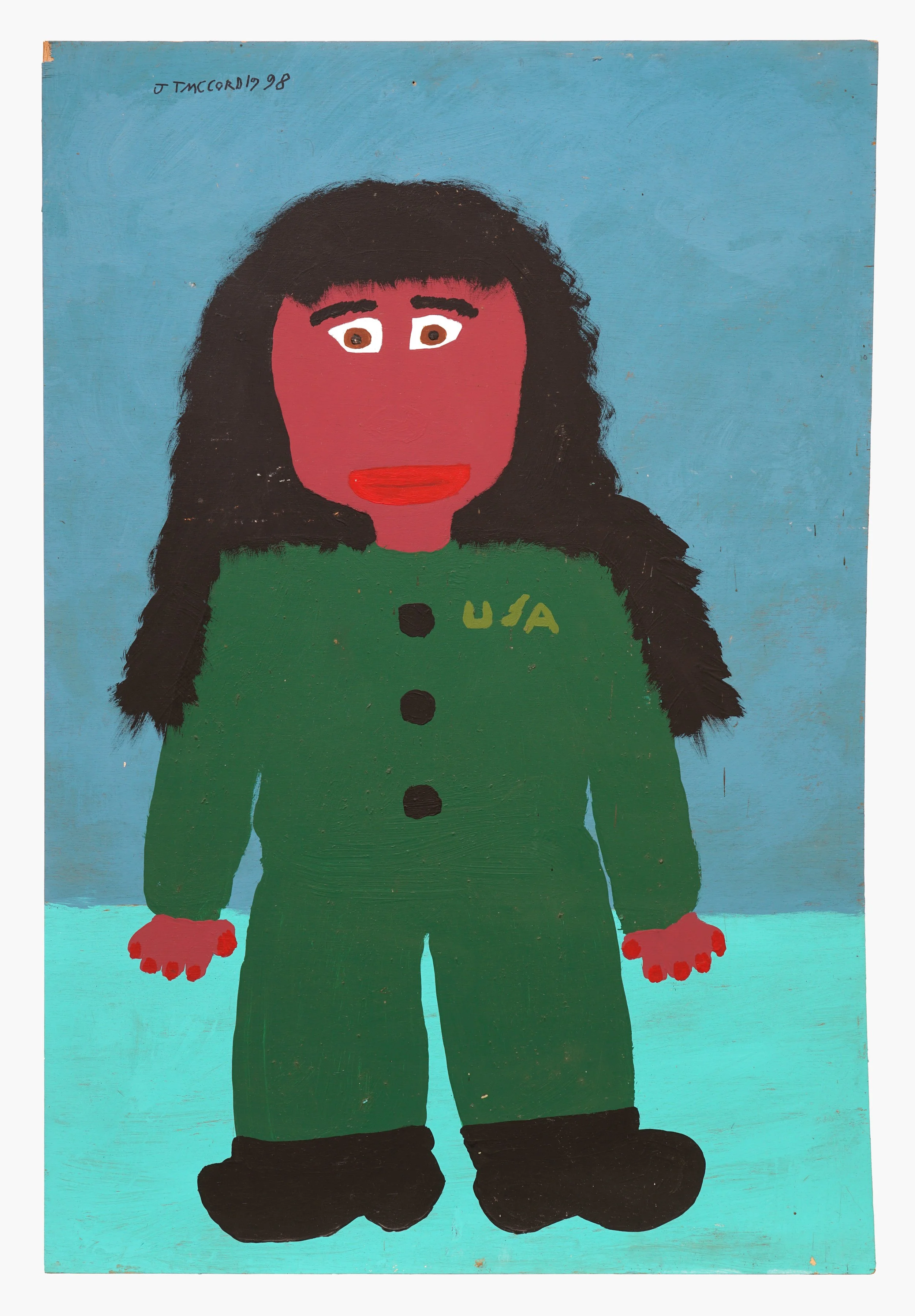 By the time of his death, Jake McCord(1948-2009) was a local celebrity in his hometown of Thomson, Georgia, where he worked full-time as a groundskeeper for 39 years while painting on the side as a hobby. McCord, a self-taught Black painter, first began creating art around 1984 after seeing a group of white women taking a painting class at the Hawes Paint store near his home. His hobbies included watching TV, fishing, attending church and making art. He enjoyed having the TV on and said he felt that it kept him company while he worked. In order to showcase his artworks, he would nail his paintings to the exterior of his home and would make sure to leave them that way until he felt enough people had seen the work.