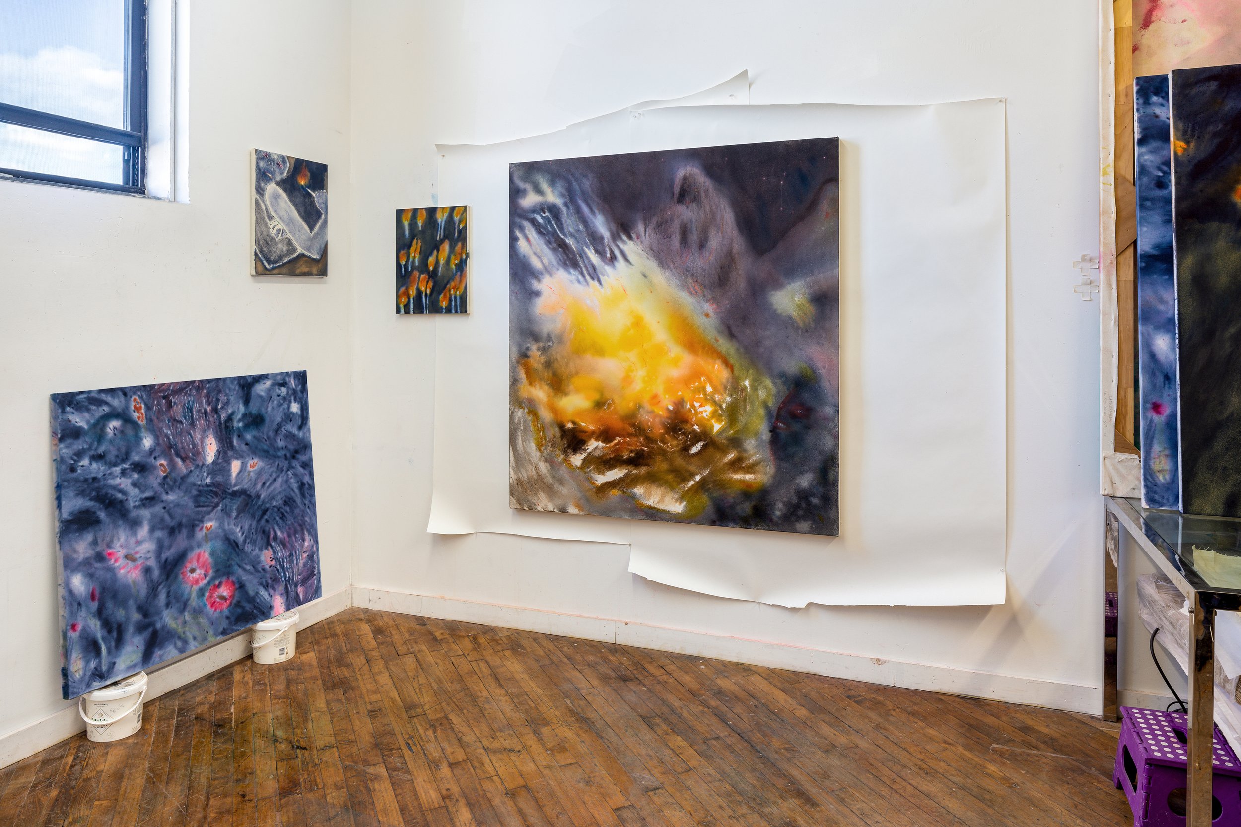 My paintings are forged out of a reciprocal relationship between medium and content. Unbound synthetic and organic pigments are applied to canvas and muslin, mixed solely with water. Utilizing water as my guide gives rise to a world that embraces fluidity.