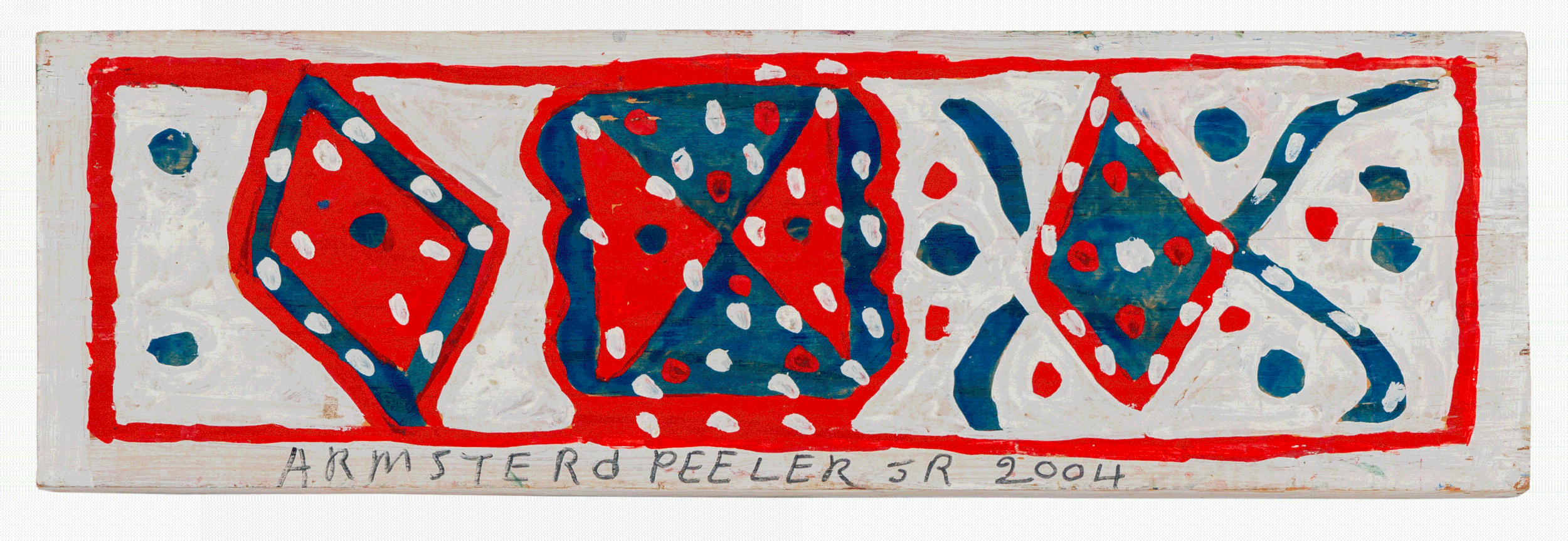 For more than 40 years, Armistead and Parlee Peeler painted together at night, working side by side in their small living room in Memphis, TN, to pass the time after work. Armistead, or “Armsterd” as he often spelled it, worked at a local sawmill and used a metal TV-tray to paint on his lap. His wife Parlee, who grew up farming, kept up their house and maintained an impressive vegetable garden. She began painting after her husband’s work began receiving attention at local fairs and festivals, where Armistead sold his double-sided paintings on found wood and jigsaw-cut panels out of the back of his obsessively decorated pickup truck.
