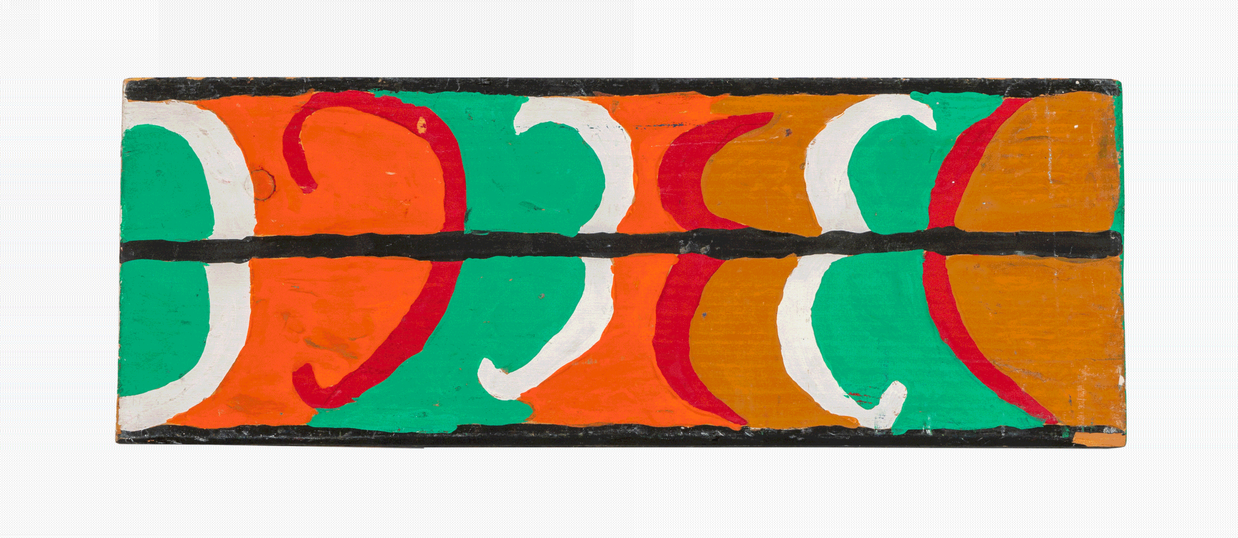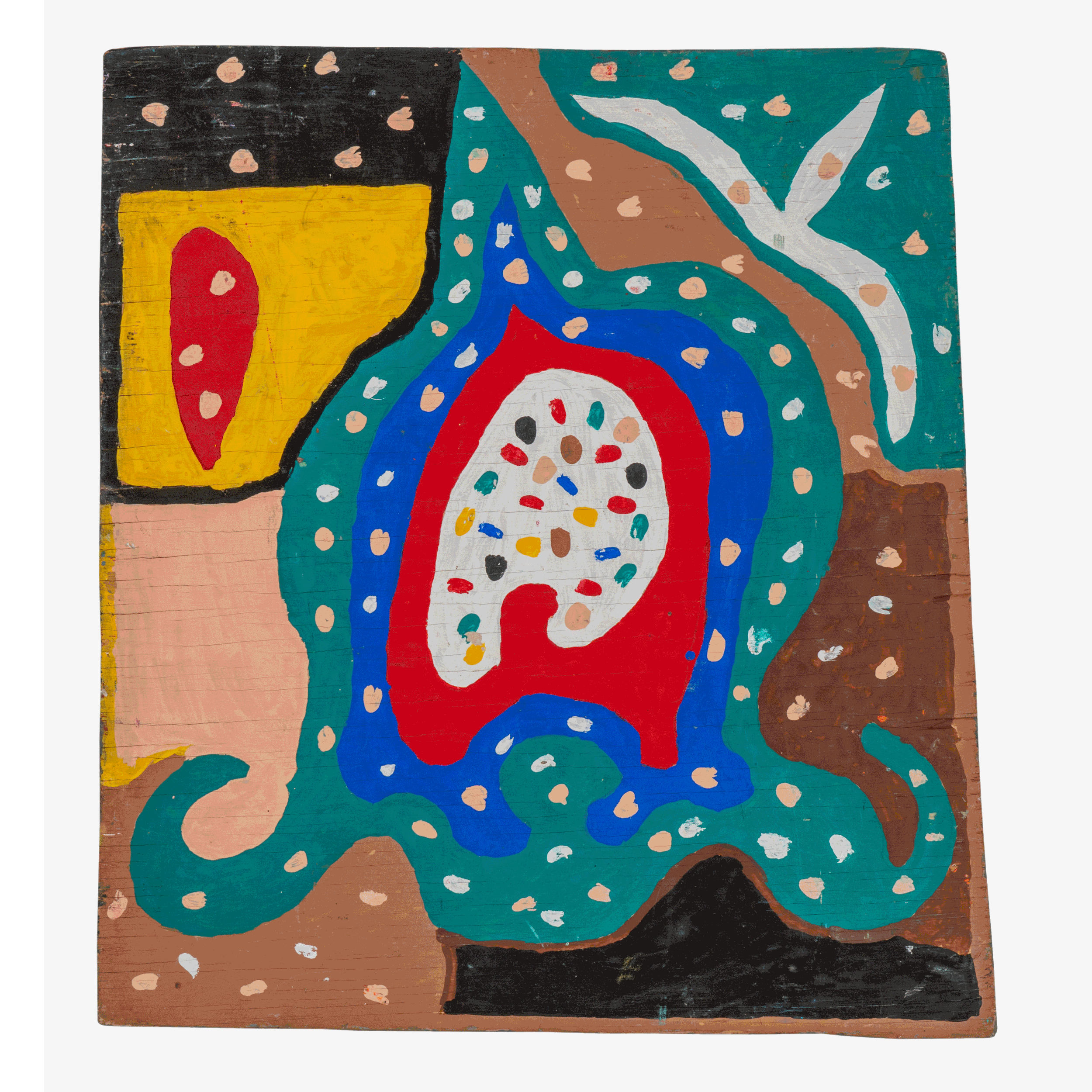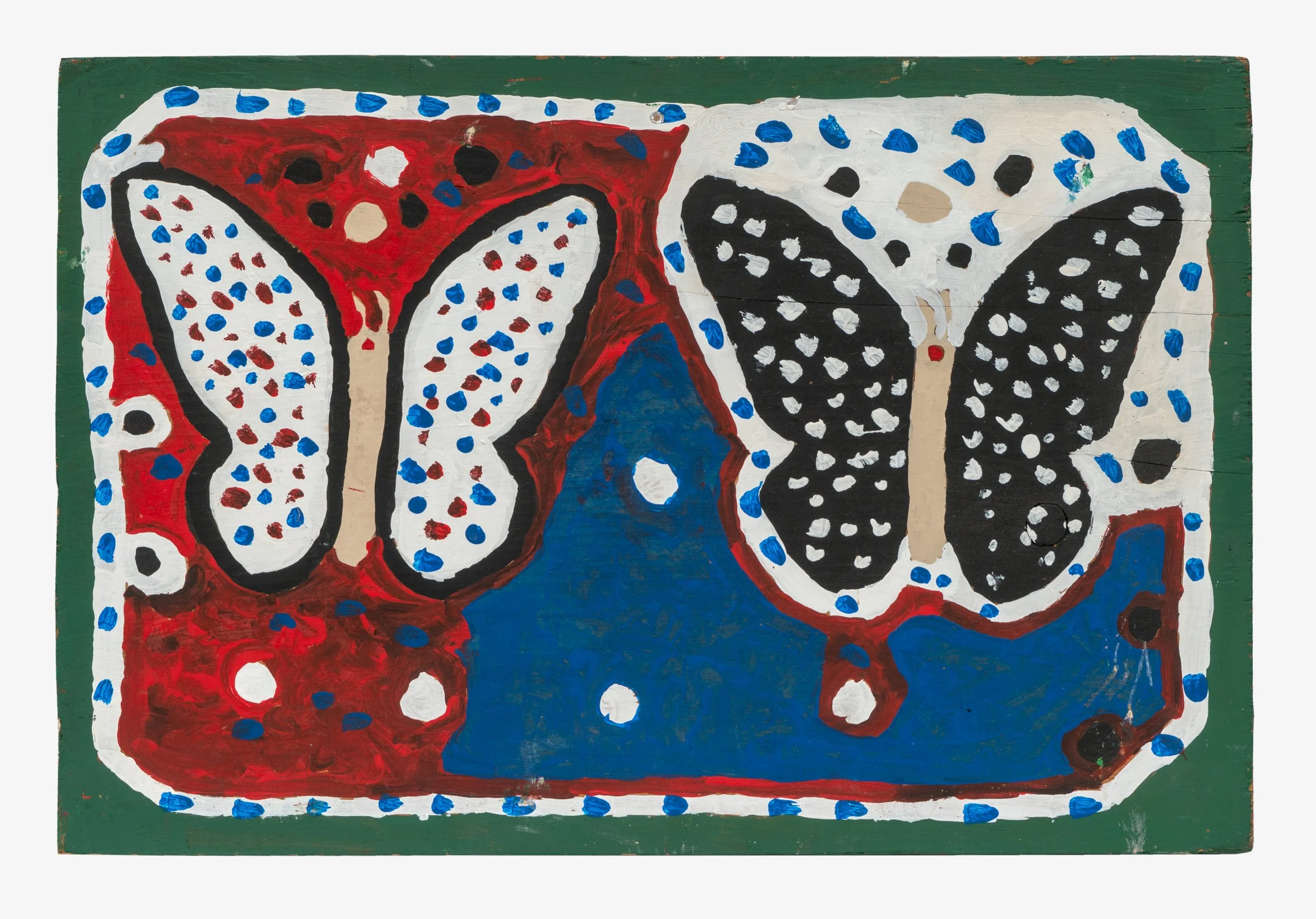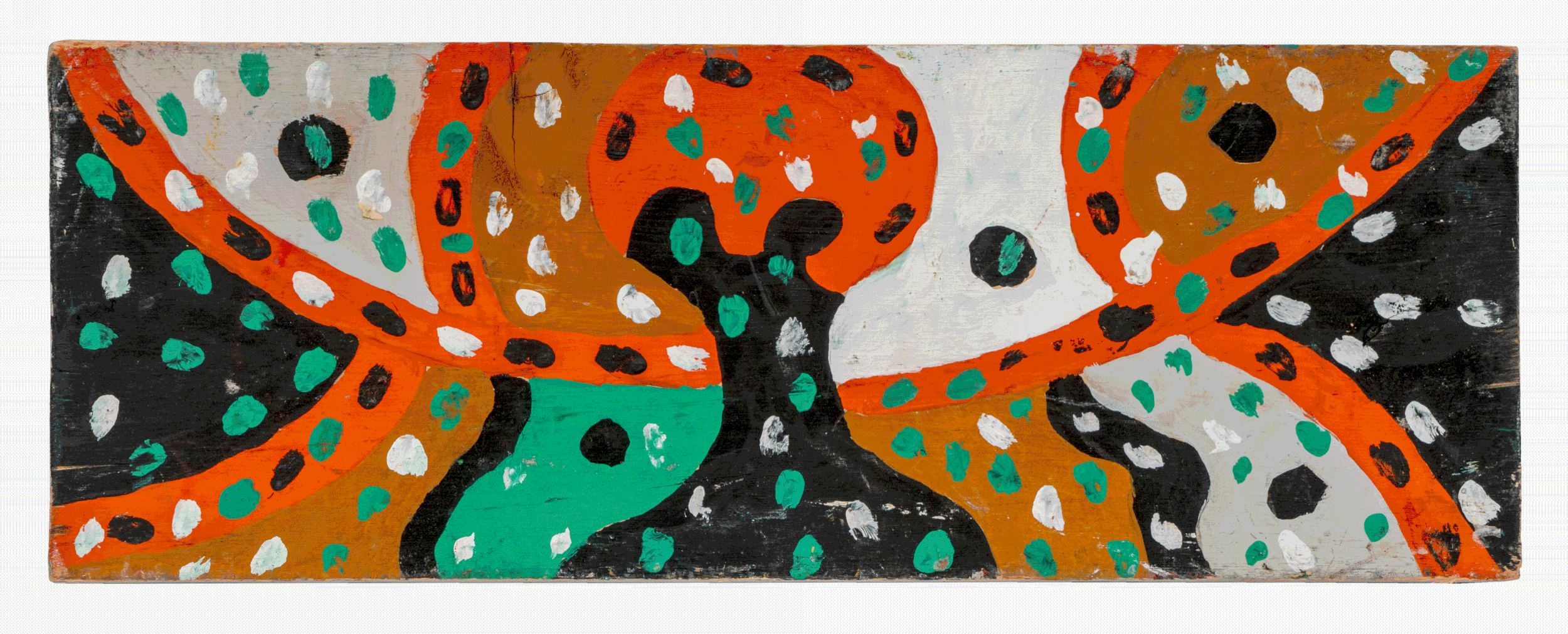 The couple developed a shared approach to art making and created images depicting smiling devils, ghosts, fantastical creatures, Santa Claus, butterflies, mermaids and rural farm animals that were all stream-of-consciousness and highly graphic. Both artists favored high-contrast, vivid palettes and deftly shifted between abstraction and more representational works. It is thought many of the finished paintings were done collaboratively with each artist painting on opposing sides of the wooden planks. It is not easy to decipher whose hand created each work, or each side of a work, so it feels important to celebrate and credit both artists’ contributions to their oeuvre in tandem.