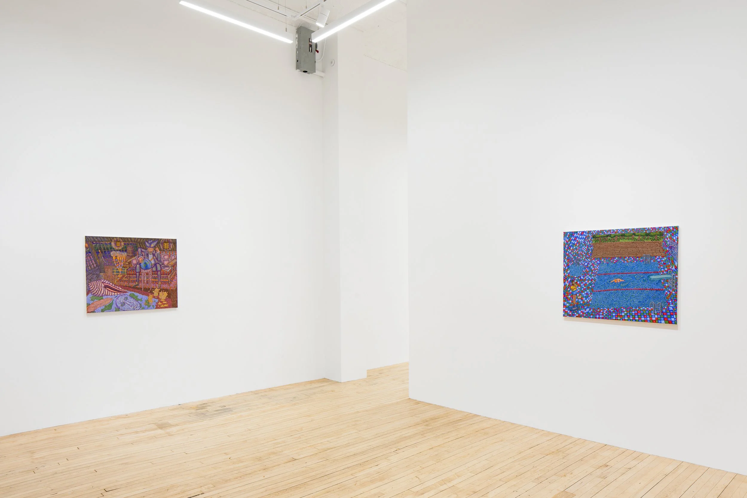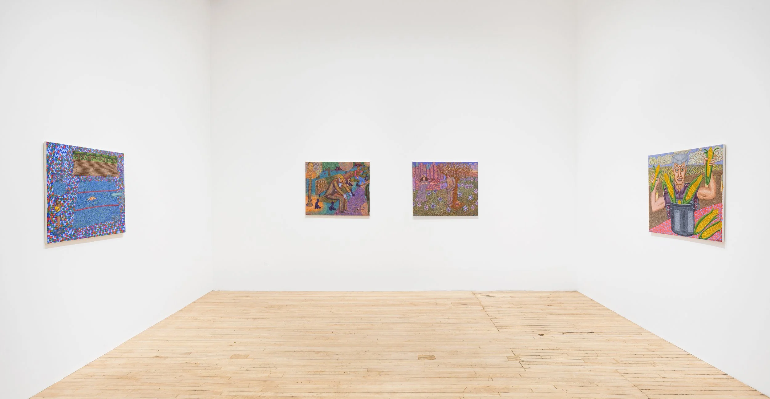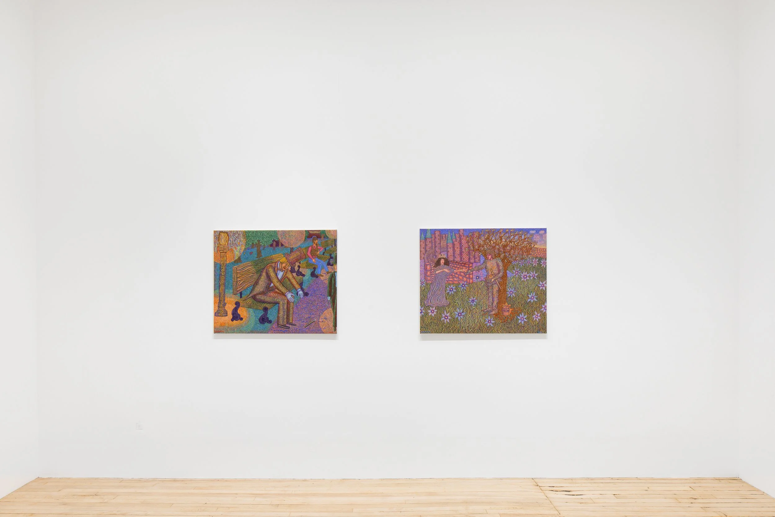 The artist’s deep dive into obsessive pointillist painting emerged spontaneously about a year ago, and it has since seamlessly integrated with his unique narratives and scenes, which now possess even more humor and pathos than before. Many of the images invoked are banal, like two pilots shooting the breeze in between flights, and others present visionary odes to his beloved wife, Johanna, full of longing and emotion. The paintings feel earnest and intuitive, reflecting a call to action and a deep level of intention in the face of uncertainty, the unknown, and the personal demons we all face.