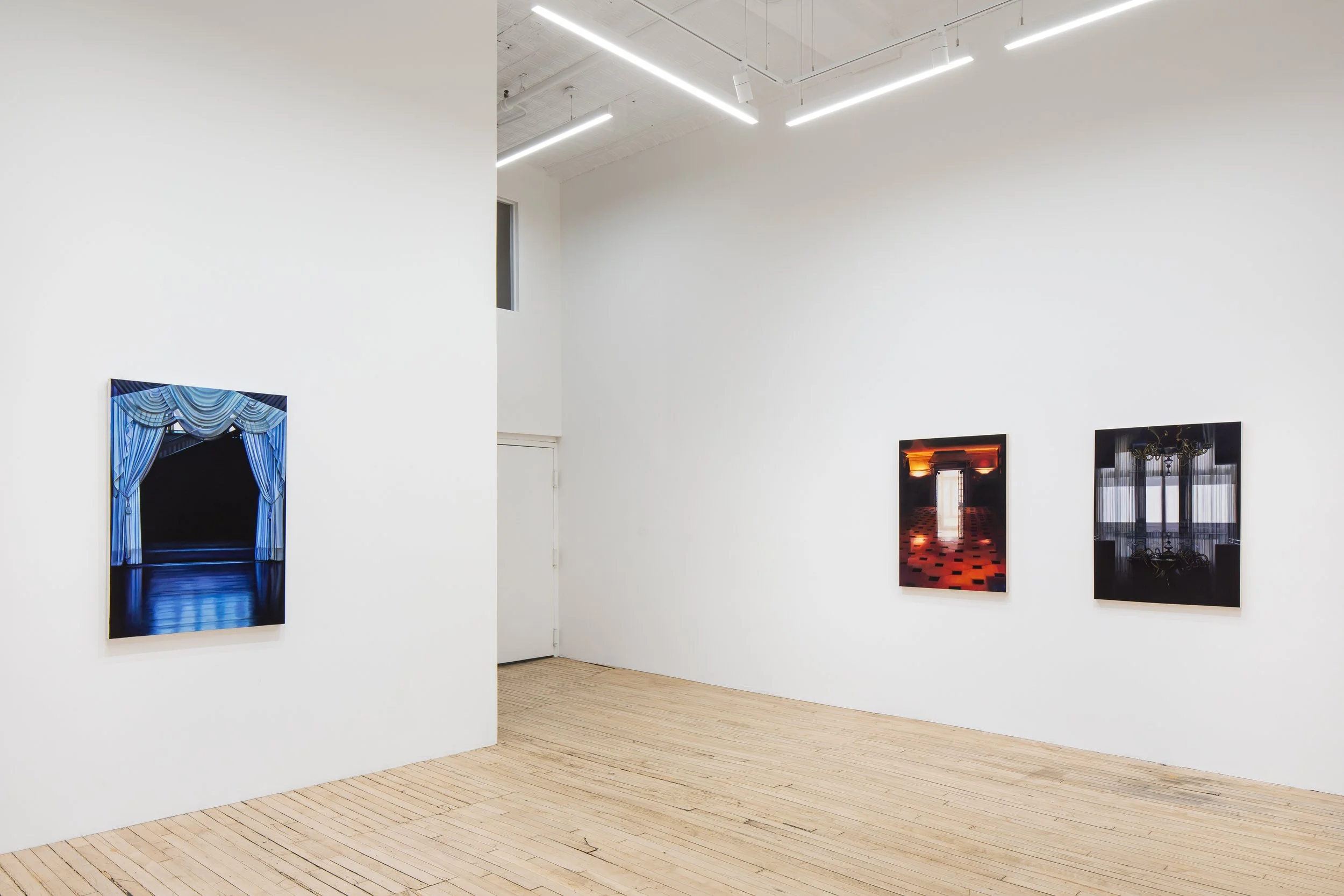 Oleon’s hallucinatory realms somehow feel instantly nostalgic. The works begin as photographs taken in rooms and public spaces with dramatic light that personally affected and moved her. Images are captured using a digital camera or old Kodachrome slide film, producing high-contrast theatrical effects that feel cinematic and vast. The images are further heightened using Photoshop and other digital means to build a more perfect order and symmetry. Cleary finding comfort in the notion of home and the effects of transcendent lighting, Oleon joyfully invites us into her private dreamscapes that reflect memories and times from her own existence and that also quite literally leave the door open for us to enter as well.