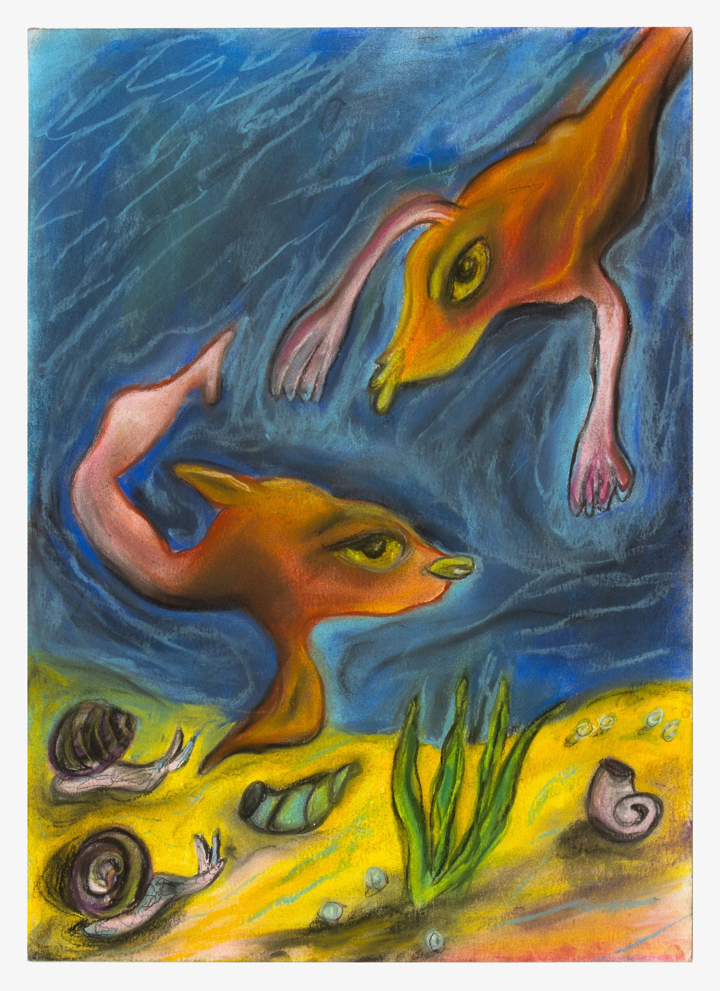 Sarah Schechter possess a unique disposition of spirit; she can absorb the chaos and dark humor around us, and then empathetically reflect it back to the world in meaningful yet still playful ways. The media for her messages are thickly-applied oil paintings– laced with sea shells, beads, glitter, sand and stones– drawings, and happily wonky ceramic forms depicting despondent pizza slices and otherworldly creatures ready to play. In her paintings, the subjects drift from almost realistic renderings of herself with her dog Mac and a solitary walrus lounging under a psychedelic pink moon, to nearly indiscernible forms that conjure up thoughts of spirits and disembodied living energy.