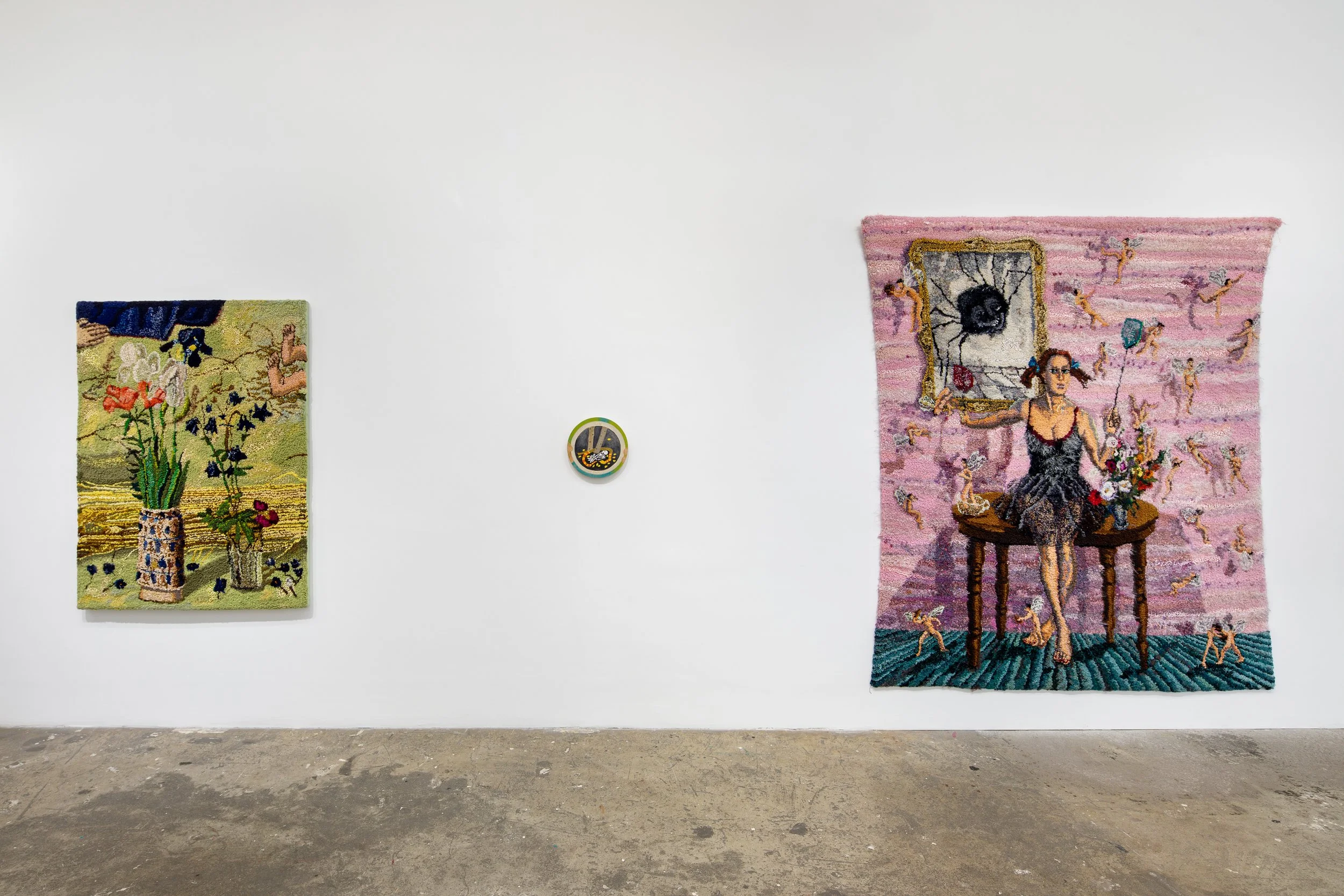 Hayley Barker and Shari Urquhart meticulously attend to every inch of their artworks using incredibly small gestures and repeating patterns, from corner to corner. Each artist drifts across large expanses of two-dimensional space using diminutive art tools made for detail and precision. For Barker, the same small paint brush used to apply oil paint onto giant canvases in irregular but repetitive strokes is used for her much smaller paintings, often creating a vibrating effect that helps define the energy and feeling of the spaces and objects she chooses for subjects. For Urquhart, delicate loops of wool, yarn and string are slowly hooked, one by one, to reveal complex narrative scenes that often span more than ten feet across.